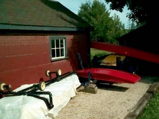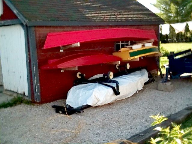 Having accumulated a few boats, storage has become a problem. Mostly, I've been stacking them one on top of the other which wasn't very good. So, I struggled for a few months now what and how to store the boats and thanks to a trip to the Welbeck Sawmill, I have a solution. Large gate hinges have been bolted to the garage wall. I then bolted 2X4s to them, angled up slightly.