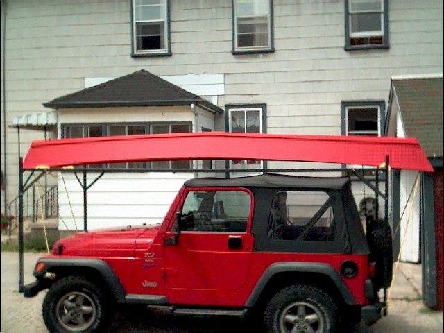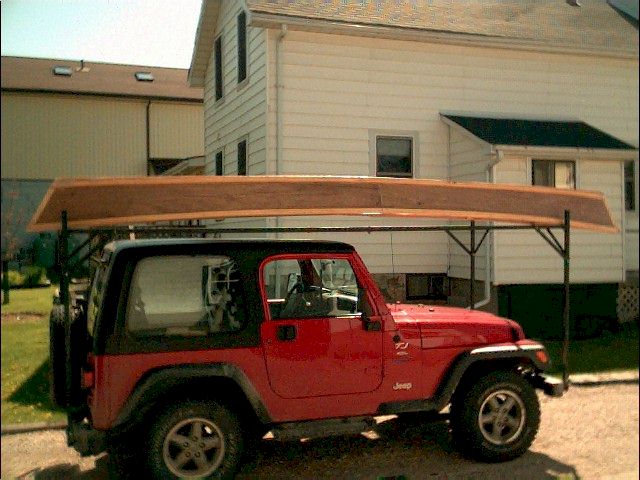 pirogue on the top of the jeep, the external trunk for the Jeep mounted and loaded