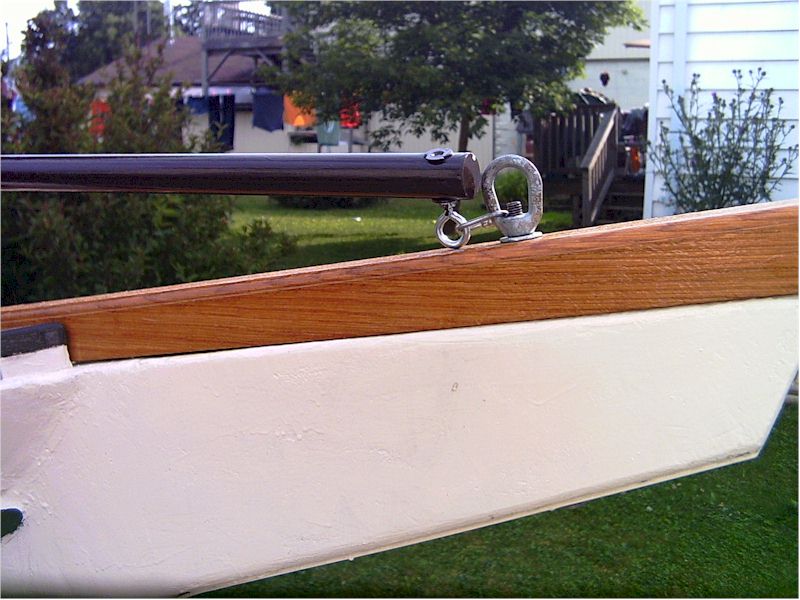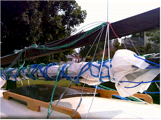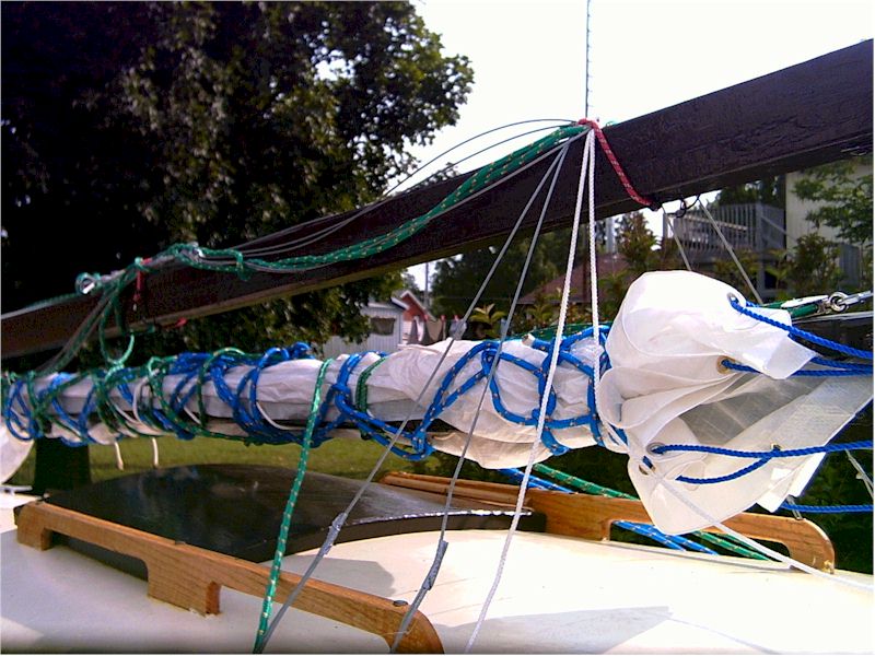 | The boom is attached and the mainsail lashed. The soft nylon line I've used for