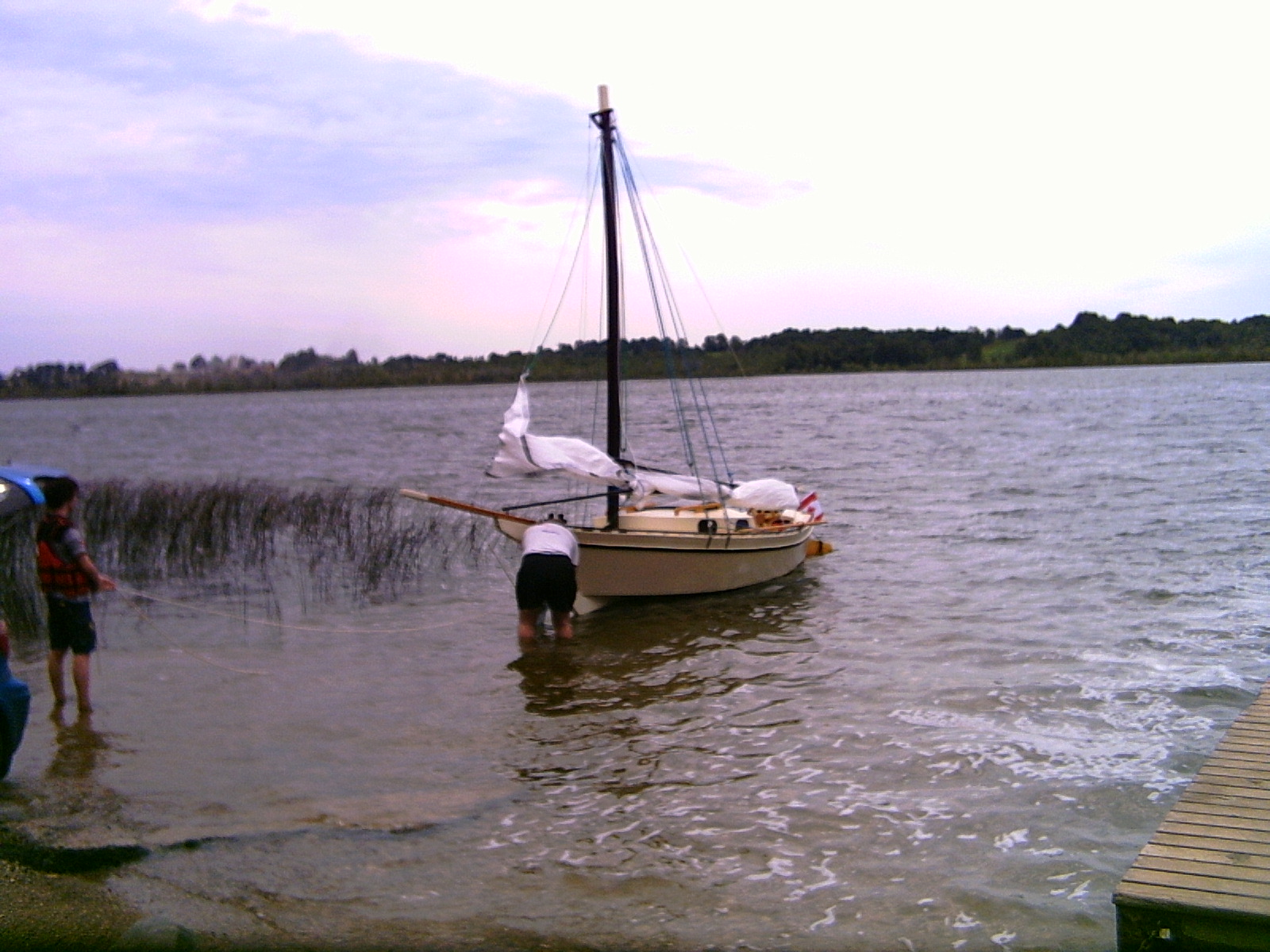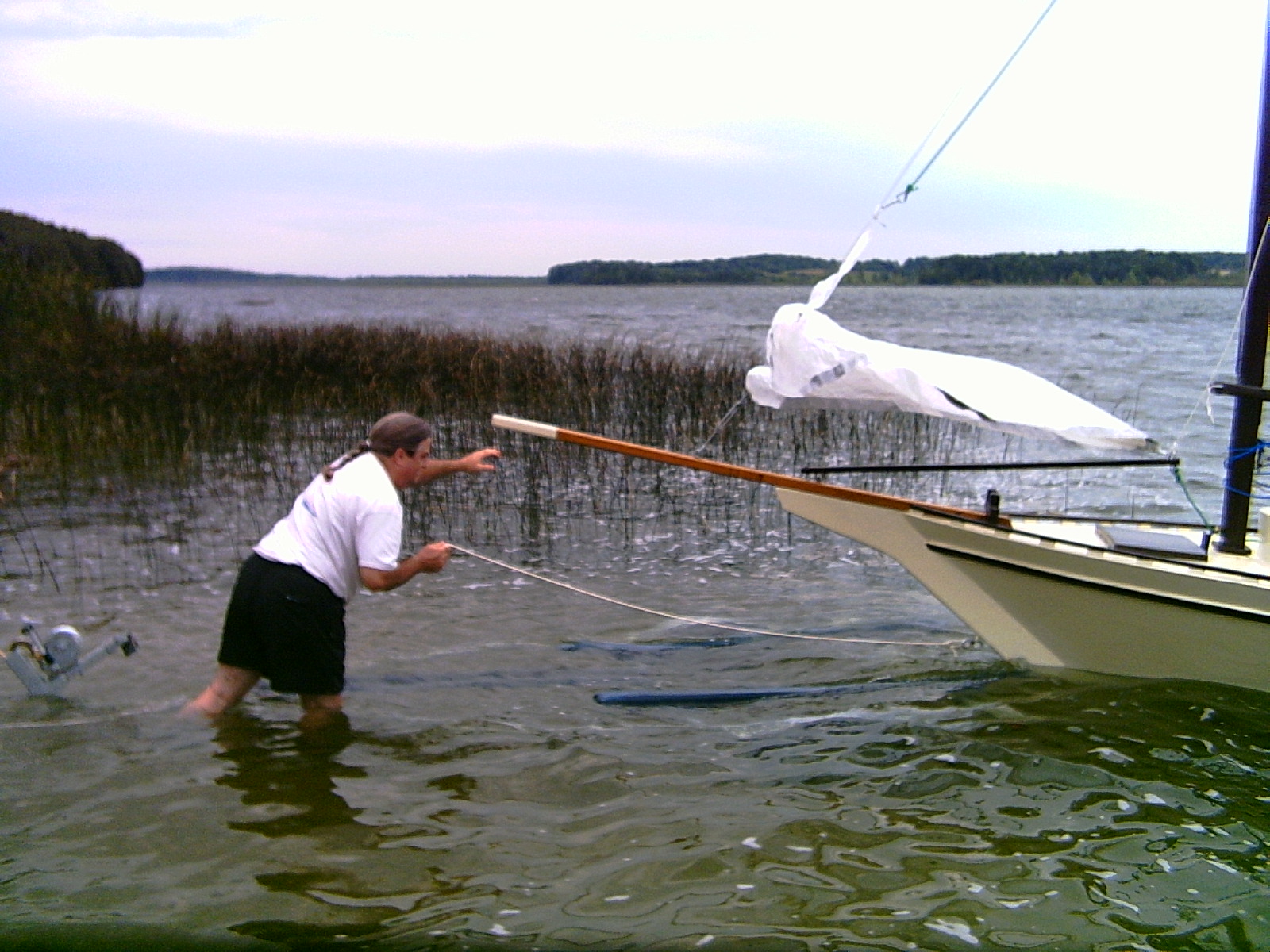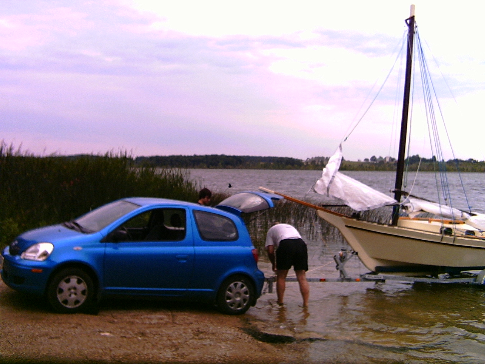 We now were (still) trying to work our way to the ramp making perhaps 10 yards of southing each tack (or gybe). The rudder kept popping up and during one of these repairs, we waited too long and a gust caught us during a gybe and forced us aground in shallow water (grounding #2). I got out, took the opportunity to tighten the shrouds which had loosened, turned the boat around (toe rails are my friends), then shoved the boat back out, leaping back in as well as an overweight middle-aged man could be expected to. A very nice gentleman, whose shore we were shipwrecked on, came over to see if we needed assistance and to offer us the use of his dock. We declined as we were actually seeing progress. More southing, while the sails are flogging themselves rather badly in the high winds, another gybe, another gust and about 10 gallons of water comes in over the rails. No bailing bucket (it was in the trunk of the car). A water bottle was emptied and Trueman started bailing while I attempted to handle both the jib sheet and main sheet while attempting to steer. Oh I forgot the mention the 2 times the drain plug was accidentally kicked out which also added to the water in the cockpit. At one point we had about 4 inches of water in the cockpit. Finally, at long last we make our way and make the ramp. Rather than attempting to dock and getting bashed around there, I just ran the boat up the ramp (steel shoe on the keel to the rescue) and started hauling sails down (grounding #3 - at least this one was on purpose). This wasnt helped by the reluctance of the peak halyard to come down. The throat came down with no problem, but the peak continues to bind. I really have to figure that one out. Fetch the car, back the trailer in while my wife and son are holding lines from the boat trying to keep it from blowing away. Back the car in, take the trailer off, tie a line to the trailer so we can find it, shove the trailer into deeper water (but not quite deep enough) manouver the boat on to the trailer (keel guides were a good idea) and winch it on. Then comes time for my wonderful plan I had a second winch that I hooked on to the safety chains on the trailer and put the hook on the cars trailer hitch. Didnt work worth beans, everything jammed, got twisted and despite the shoe on the bottom of the trailer that should have slid along the bottom, it kept getting hung up. So back the car in far enough (water almost to the car doors), put the trailer on, and pop it out with no fuss at all (dont know why I was worried).