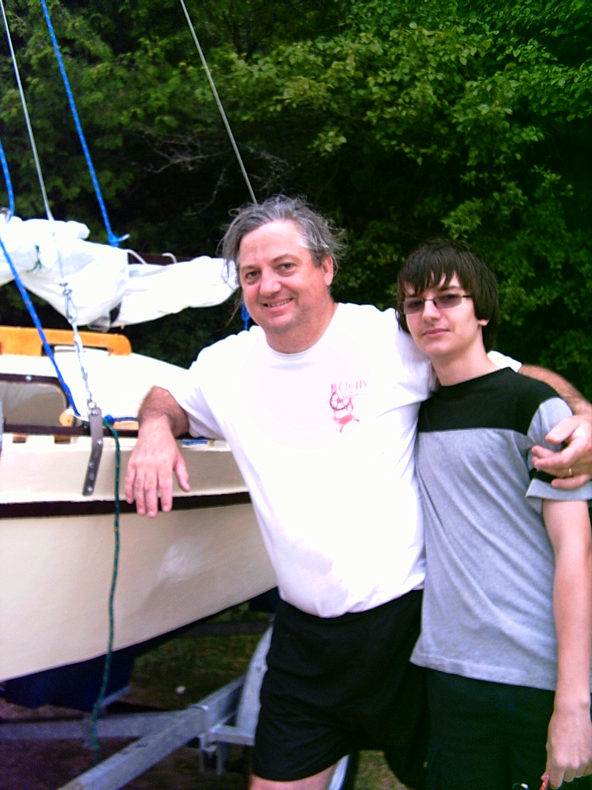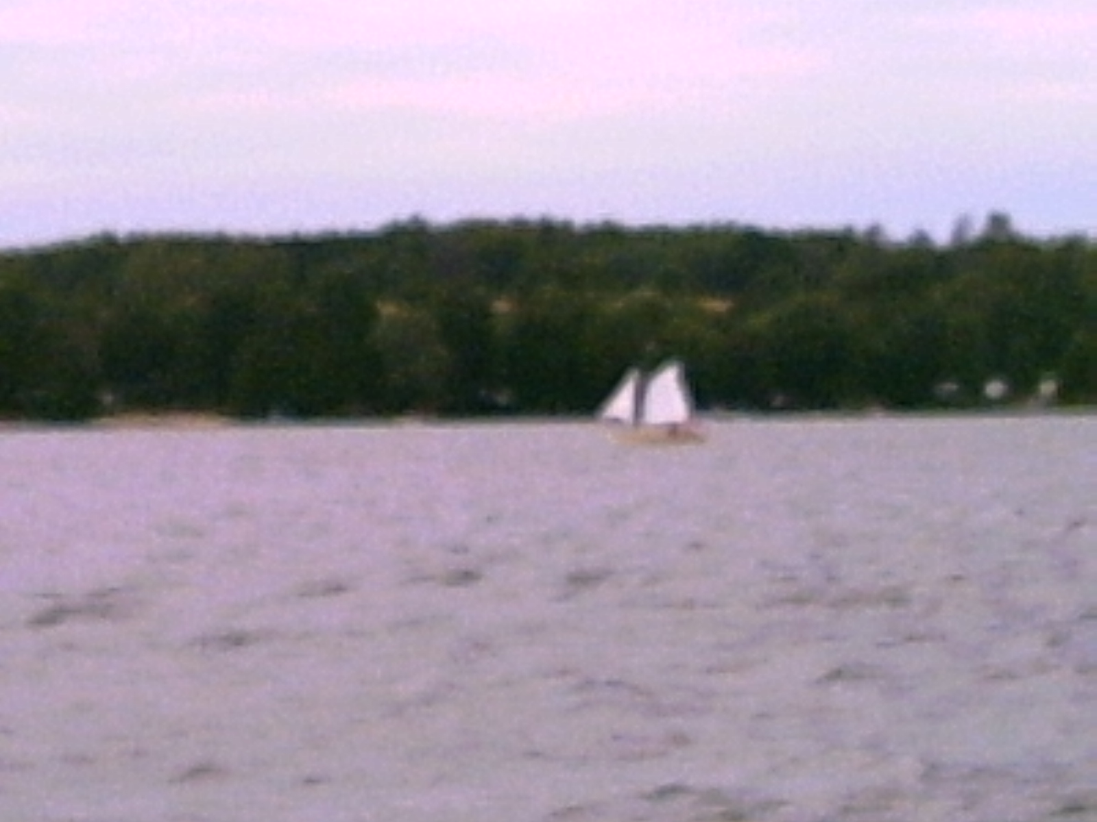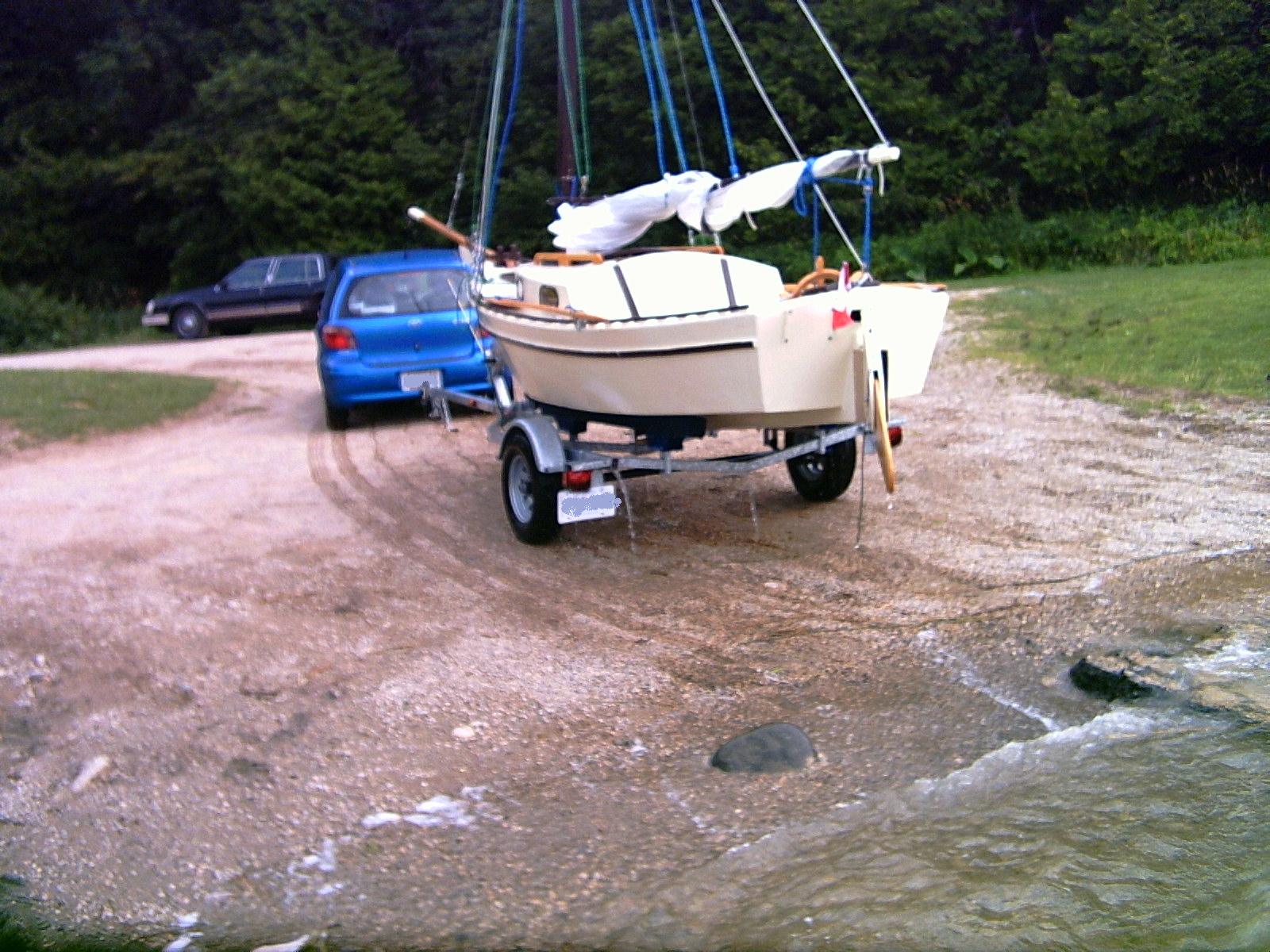 We now were (still) trying to work our way to the ramp making perhaps 10 yards of southing each tack (or gybe). The rudder kept popping up and during one of these repairs, we waited too long and a gust caught us during a gybe and forced us aground in shallow water (grounding #2). I got out, took the opportunity to tighten the shrouds which had loosened, turned the boat around (toe rails are my friends), then shoved the boat back out, leaping back in as well as an overweight middle-aged man could be expected to. A very nice gentleman, whose shore we were shipwrecked on, came over to see if we needed assistance and to offer us the use of his dock. We declined as we were actually seeing progress. More southing, while the sails are flogging themselves rather badly in the high winds, another gybe, another gust and about 10 gallons of water comes in over the rails. No bailing bucket (it was in the trunk of the car). A water bottle was emptied and Trueman started bailing while I attempted to handle both the jib sheet and main sheet while attempting to steer. Oh I forgot the mention the 2 times the drain plug was accidentally kicked out which also added to the water in the cockpit. At one point we had about 4 inches of water in the cockpit. Finally, at long last we make our way and make the ramp. Rather than attempting to dock and getting bashed around there, I just ran the boat up the ramp (steel shoe on the keel to the rescue) and started hauling sails down (grounding #3 - at least this one was on purpose). This wasnt helped by the reluctance of the peak halyard to come down. The throat came down with no problem, but the peak continues to bind. I really have to figure that one out. Fetch the car, back the trailer in while my wife and son are holding lines from the boat trying to keep it from blowing away. Back the car in, take the trailer off, tie a line to the trailer so we can find it, shove the trailer into deeper water (but not quite deep enough) manouver the boat on to the trailer (keel guides were a good idea) and winch it on. Then comes time for my wonderful plan I had a second winch that I hooked on to the safety chains on the trailer and put the hook on the cars trailer hitch. Didnt work worth beans, everything jammed, got twisted and despite the shoe on the bottom of the trailer that should have slid along the bottom, it kept getting hung up. So back the car in far enough (water almost to the car doors), put the trailer on, and pop it out with no fuss at all (dont know why I was worried).