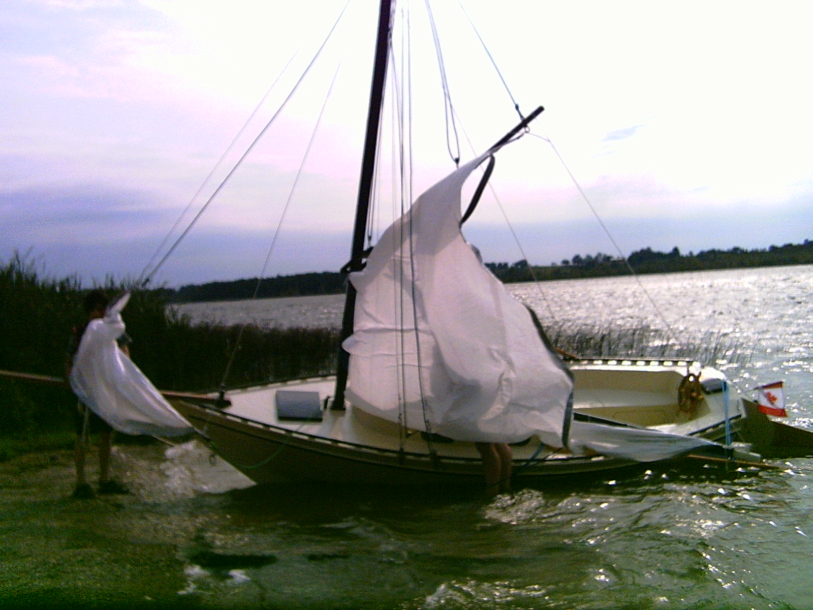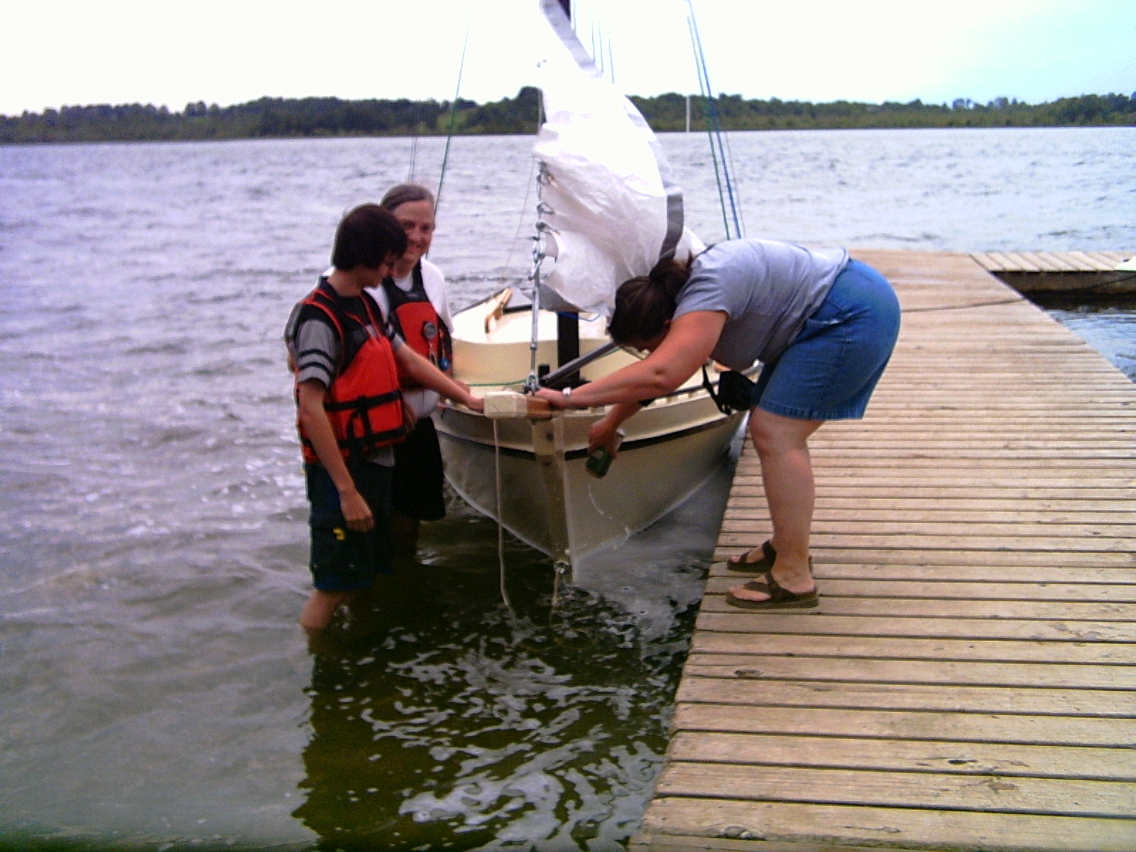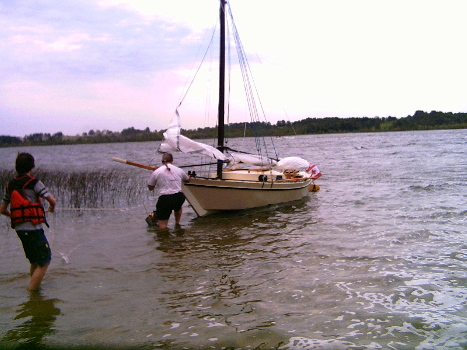 August 3rd, 2009Despite an unfavourable weather forecast - winds out of the south at 20 knots gusting higher, we determined to launch the Weekender. We chose Aaron Lake, a local smaller lake just in shore from Lake Huron. It has a nice public launch ramp and in past visits was pretty quiet. I thought that on an overcast, cool day with strong winds that no one would be there. I was wrong. Aaron LakeView Larger Map The drive up to the lake was uneventful and my tiny Toyota Echo did a great job of pulling the boat along. The ramp area was somewhat crowded so we backed into an out of the way corner and started to rig up the boat. Fortunately my patient and loving wife came up in her 4X4 with the camera and a tow strap (just in case). After christening the boat Floating Bear with some East India Pale Ale, and with the assistance of some on-lookers, my 15 year-old son and I managed to get the boat (with sails down) shoved around the dock and out into the water. It was my plan to row out to open water and then hoist the sails. This plan was thwarted by the reluctance of the boat to be rowed in any direction, especially backwards, that and the fact that the rudder wouldnt stay down didnt help. We then sailed sideways (grounding #1) into a field of weeds that I ended up using an oar as a barge-pole to escape. The one oar lock had by this point popped out of it's holder and wouldn't stay down. At this point I was satisfied that I had done my duty and that the boat had been launched. The weather gods had other ideas - perhaps they didn't like the beer. Strong winds from the south kept blowing us north and we were unable to point the boat south (in part perhaps because the rudder wouldnt stay down) and couldnt make any progress. So this is a sailboat, lets sail south and because of the high winds, we hoisted just the jib. No luck the boat continued to refuse to point south at all but we did manage to actually sail around a bit, as long as south was not any part of our plans. Also, being unable to point into the wind caused us to have to gybe rather than tack. Rowing also didnt help and we couldnt turn the boat around even with the help of the oars.