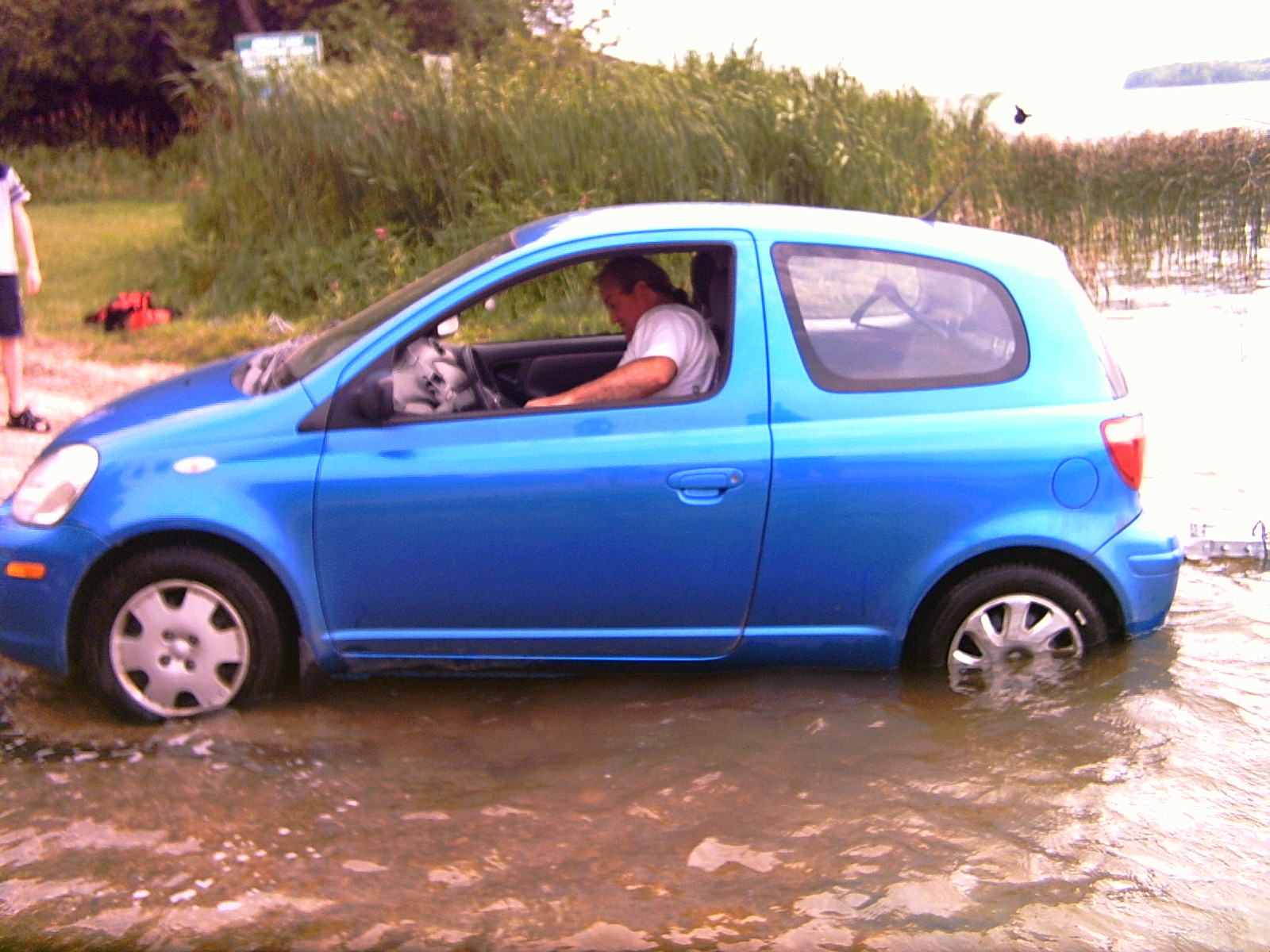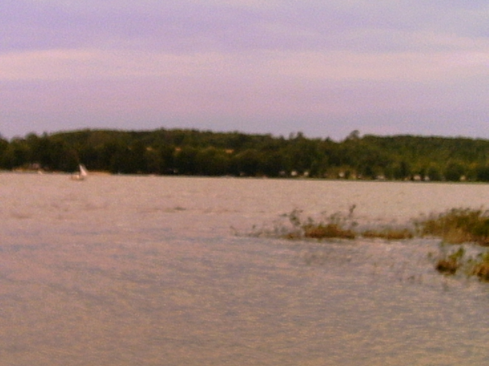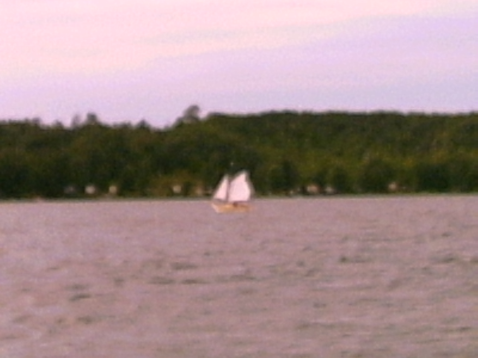 August 3rd, 2009Despite an unfavourable weather forecast - winds out of the south at 20 knots gusting higher, we determined to launch the Weekender. We chose Aaron Lake, a local smaller lake just in shore from Lake Huron. It has a nice public launch ramp and in past visits was pretty quiet. I thought that on an overcast, cool day with strong winds that no one would be there. I was wrong. Aaron LakeView Larger Map The drive up to the lake was uneventful and my tiny Toyota Echo did a great job of pulling the boat along. The ramp area was somewhat crowded so we backed into an out of the way corner and started to rig up the boat. Fortunately my patient and loving wife came up in her 4X4 with the camera and a tow strap (just in case). After christening the boat Floating Bear with some East India Pale Ale, and with the assistance of some on-lookers, my 15 year-old son and I managed to get the boat (with sails down) shoved around the dock and out into the water. It was my plan to row out to open water and then hoist the sails. This plan was thwarted by the reluctance of the boat to be rowed in any direction, especially backwards, that and the fact that the rudder wouldnt stay down didnt help. We then sailed sideways (grounding #1) into a field of weeds that I ended up using an oar as a barge-pole to escape. The one oar lock had by this point popped out of it's holder and wouldn't stay down. At this point I was satisfied that I had done my duty and that the boat had been launched. The weather gods had other ideas - perhaps they didn't like the beer. Strong winds from the south kept blowing us north and we were unable to point the boat south (in part perhaps because the rudder wouldnt stay down) and couldnt make any progress. So this is a sailboat, lets sail south and because of the high winds, we hoisted just the jib. No luck the boat continued to refuse to point south at all but we did manage to actually sail around a bit, as long as south was not any part of our plans. Also, being unable to point into the wind caused us to have to gybe rather than tack. Rowing also didnt help and we couldnt turn the boat around even with the help of the oars.