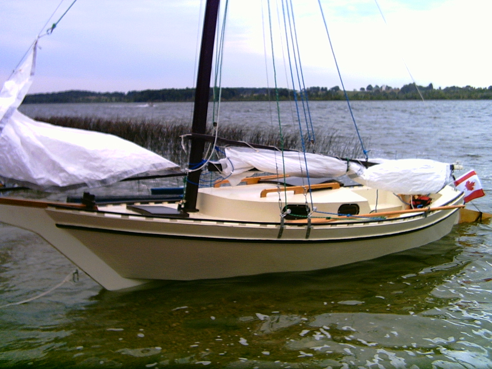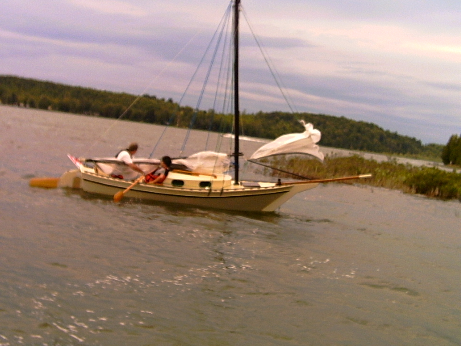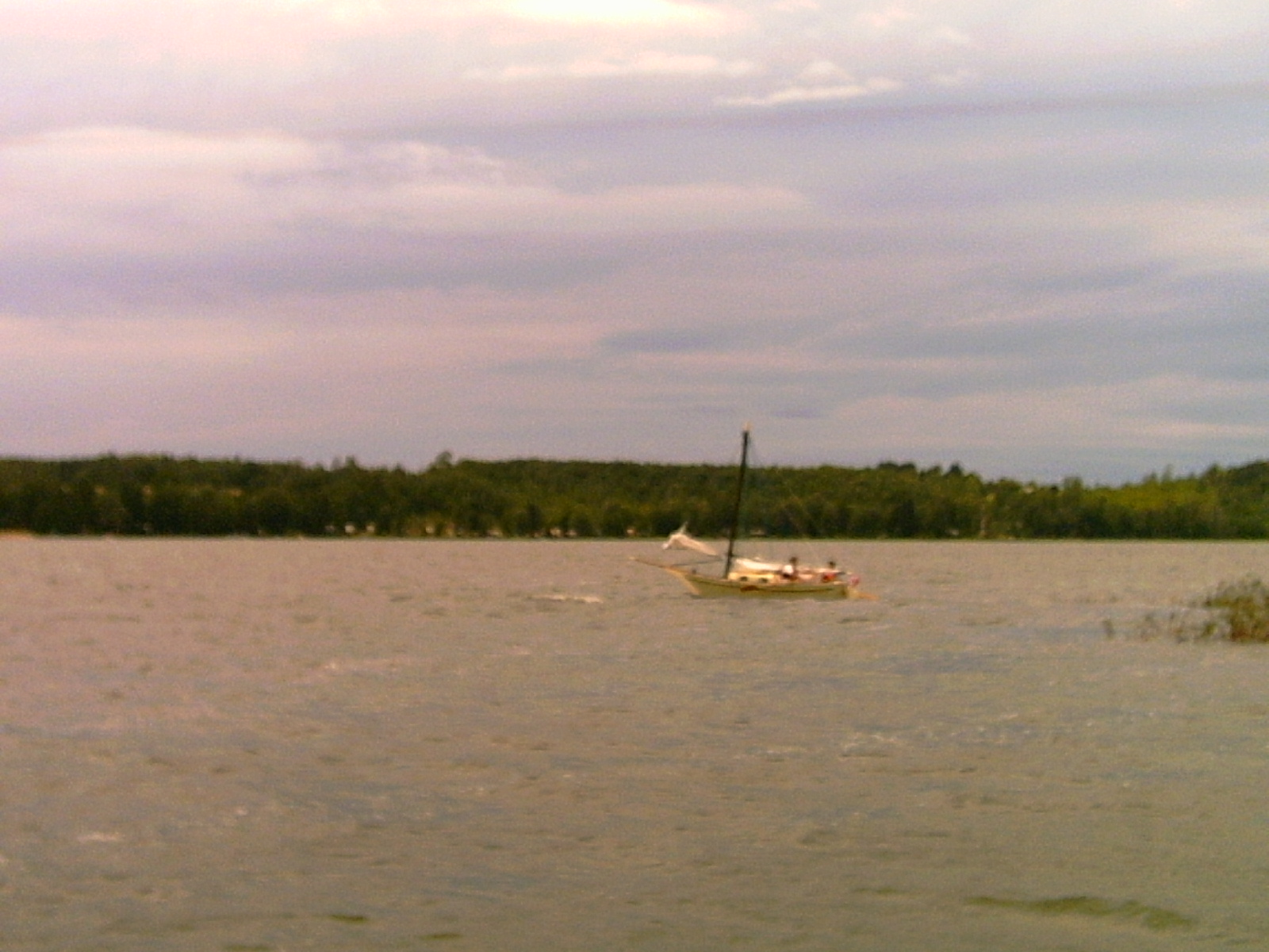 I finally realized that with just the jib, of course the bow of the boat was being blown north, so I handed the helm to my son Trueman, told him that if I fell in to let go of all the controls, then climbed up to the foredeck (all 250lbs of me) and manually pulled the jib down. The so clever method I had though of to douse the jib (never to be revealed now) did not work. I then hoisted the mainsail with a reef in it (about 2). It flogged rather unmercifully, but we started to be able to point higher. The steering was feeling loose though, so I opened the deck hatch (a very handy thing) and tried to tighten the turnbuckle I had installed for just such an occasion. Unfortunately, I turned it the wrong way and everything fell apart. We were about 200 yards from a lee shore at this point, moving rather briskly. I managed to get the steering repaired just in time and we tried to tack. No luck, the boat wouldnt come right up into the wind, so we gybed just in time. We started working our way south with some slight success and decided to hoist the jib again. Surprisingly it helped rather than hurt our ability to go to windward.